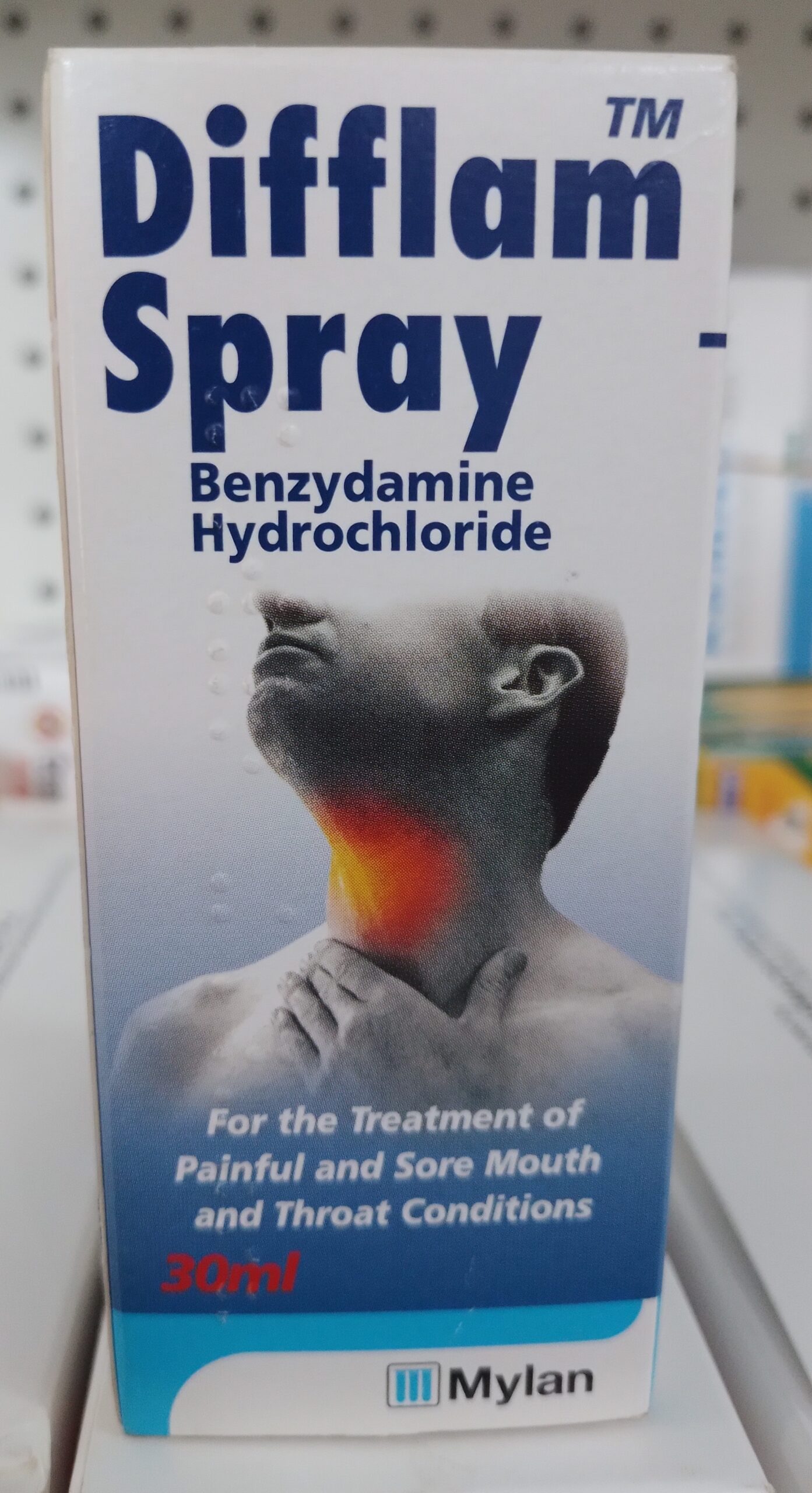 Difflam spray is an oral spray which contains the drug benzydamine, and is often used to treat sore throats, painful gums or mouth ulcers.